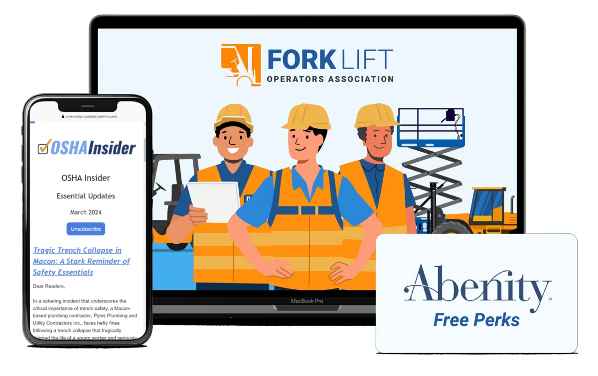As a new member of the Forklift Operator Association, you'll enjoy significant savings with Abenity discounts, stay ahead with a year's access to a private community for OSHA updates, and receive complimentary OSHA Insider access to keep you informed and compliant.